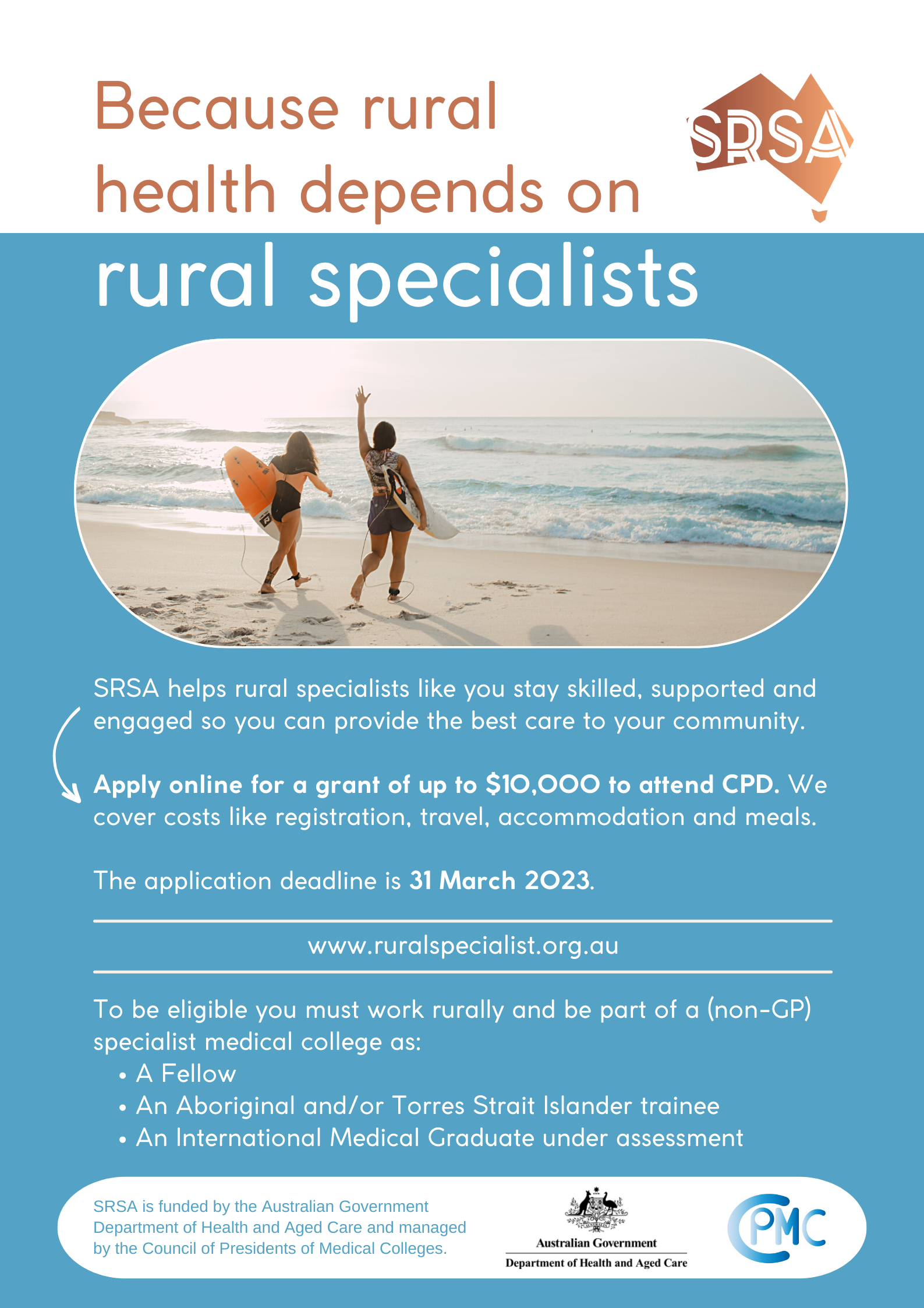 Support for Rural Specialists in Australia (SRSA) helps rural specialists like you stay skilled, supported and engaged so you can provide the best care to your community.